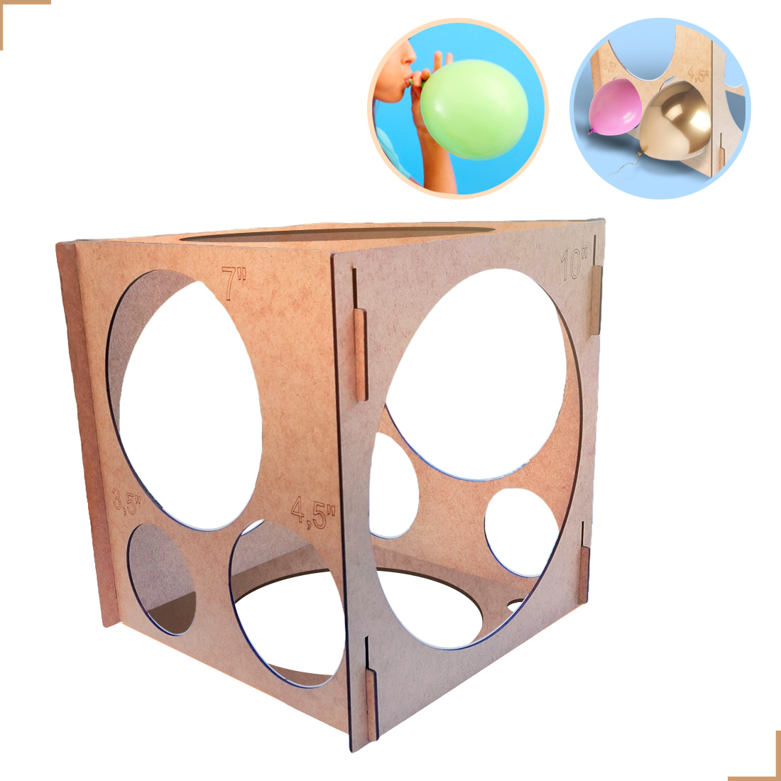 MEDIDOR DE BALÕES PROFISSIONAL EM MDF – CUBO DESMONTÁVEL (1” A 10”)